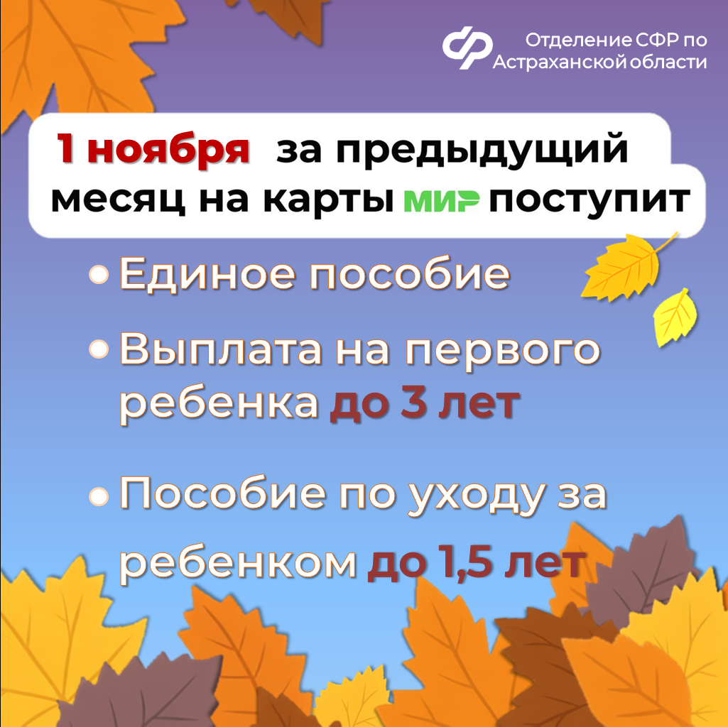 Напомним, что перечисления осуществляются в новом месяце за предыдущий. Это значит, что в ноябре вы получаете пособия за октябрь. Если дата выплат приходится на выходной или праздничный день, то денежные средства переводят на банковские счета накануне в рабочий день. Поэтому единое пособие, выплату на первого ребенка до 3 лет и пособие по уходу за ребенком до 1,5 лет для неработающих родителей, запланированные на 3 число, Отделение СФР по Астраханской области перечислит на два дня раньше — 1 ноября, в рабочую субботу.