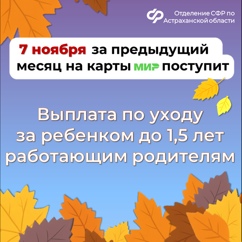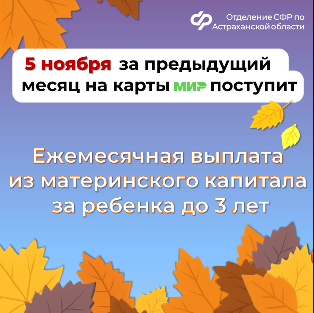 Также раньше срока придёт пособие по уходу за ребенком до 1,5 лет для работающих родителей. С субботы, 8 ноября, выплату перенесли в этом месяце на пятницу — 7 ноября. Без изменений в этом месяце осталась ежемесячная выплата из материнского капитала за ребенка до 3 лет. Её астраханские семьи получат, как и положено, 5 числа.